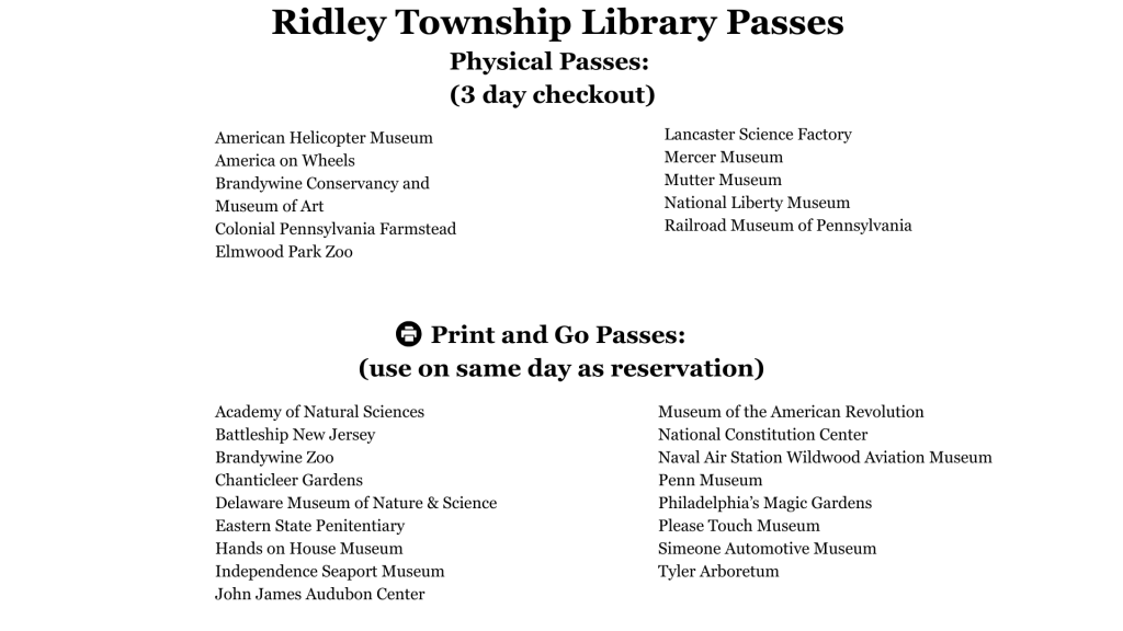 Physical Passes must be returned to the Ridley Township Public Library. Passes returned past the due date will incur a late charge of $3 per day.